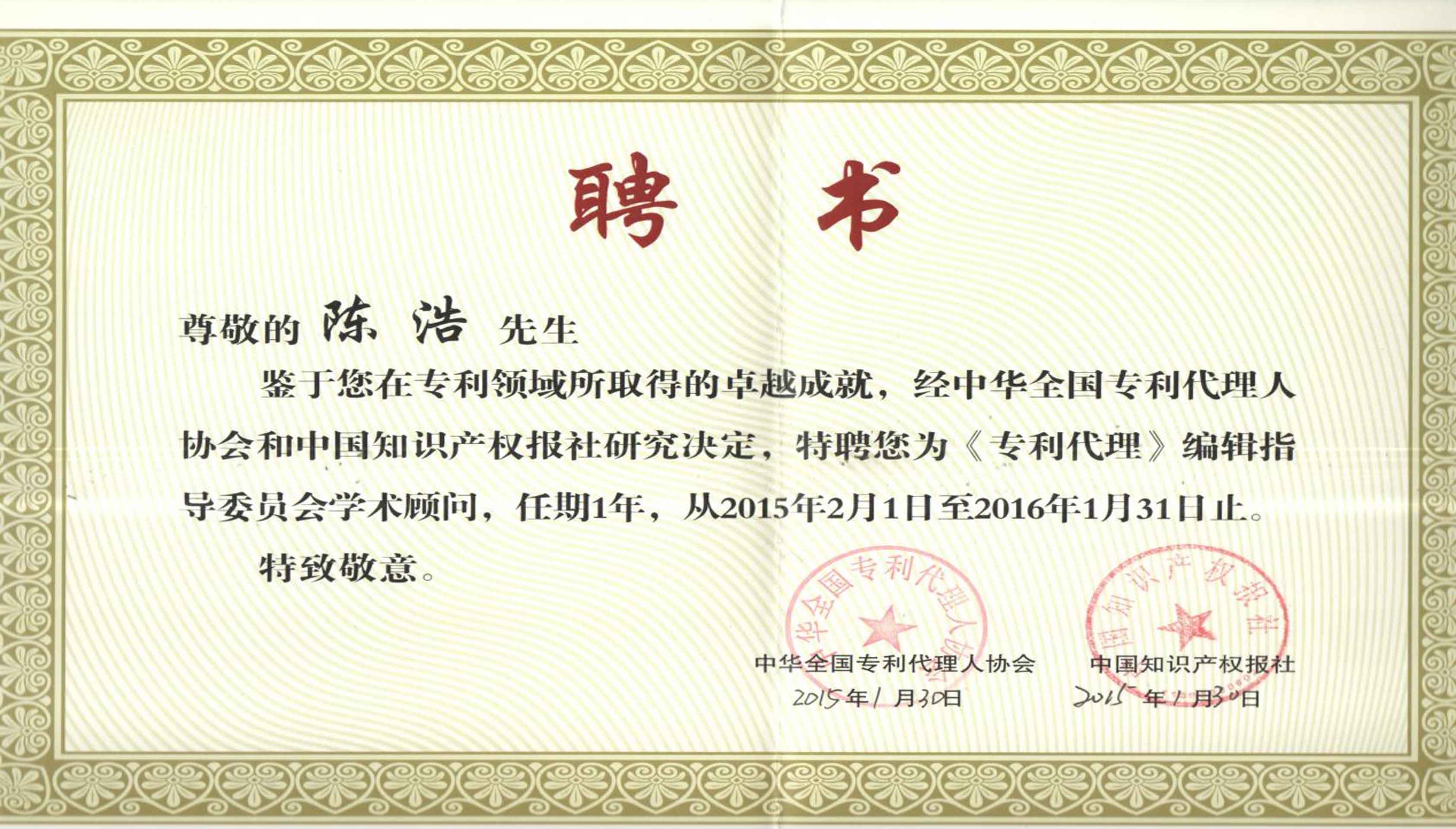 2015年1月公司总经理陈浩受聘担任《专利代理》杂志学术顾问。