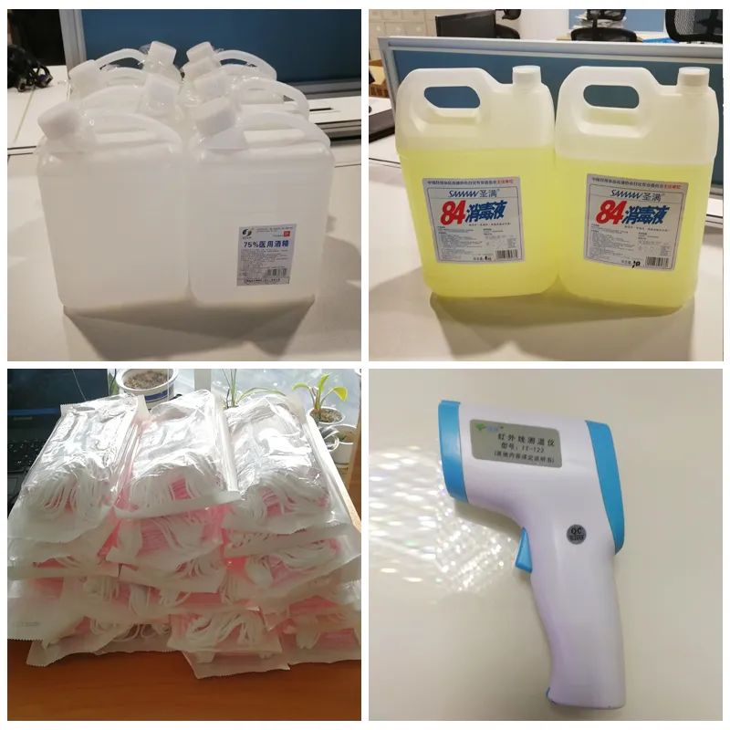 酒精、消毒液已备好,一次性口罩、额温枪已到位,消毒人员对公司办公场地甚至各个角落进行全面细致的消毒。